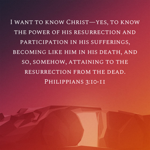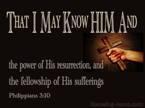 Philippians 3:10-11 “that I may know him and the power of his resurrection, and may share his sufferings, becoming like him in his death, 11 that by any means possible I may attain the resurrection from the dead.”