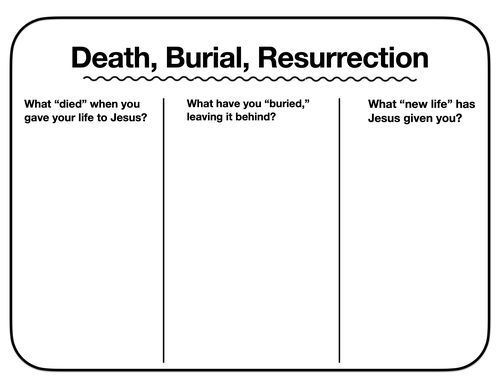 Do you have a photo or video of your baptism? Is it just a picture in your mind? Share the picture (or description from your memory) with another person, and ask for their memories of their baptism. In what way(s) did you “die” with Christ at that time? What did you bury or leave behind? And what has been your new life since that time? You can use a sheet of paper and mark three columns with the first being “What died when you gave your life to Jesus.” The middle column could have at the top “What have you buried, leaving it behind?” And the column on the right would be “What new life has Jesus given you?” Fill this out and share it with another person. While you share, you might add some other elements to it.
