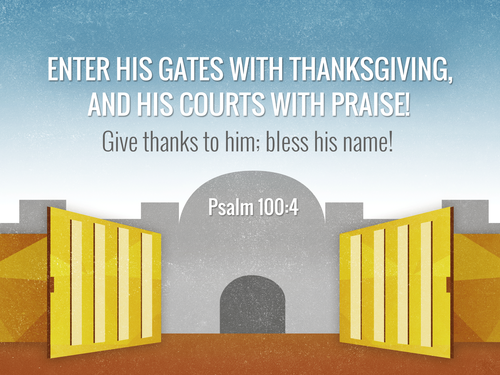 - Older kids and Parents: does worship, thanksgiving and praise help us enter more fully into the presence of God? Why would this be, and how does it work? What is the message Psalm 100 is trying to teach us?